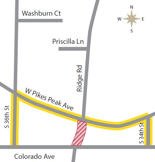 Progress on the Westside Avenue Action Plan, also known as Colorado and Manitou Ave through “no mans land”, is coming along. Starting January 8th, the short section of Ridge road, between Pikes Peak Ave and Colorado Ave will be permanently closed to make way for a new transit and trail plaza. Ridge road from Garden of the Gods, to the north, will end with a T intersection at Pikes Peak Ave and Ridge Road from Highway 24 will end in a T intersection, eventually with a traffic light, at Colorado Ave. El Paso County officials recommend drivers and cyclists to take Colorado Ave. to S. 36th Street or S. 34th Street to connect with W. Pikes Peak Avenue and Ridge Road.