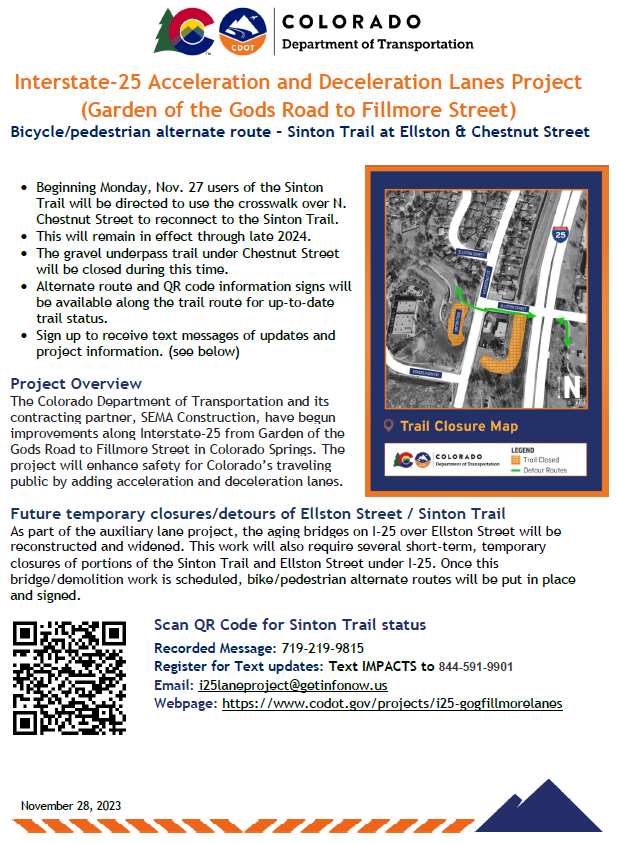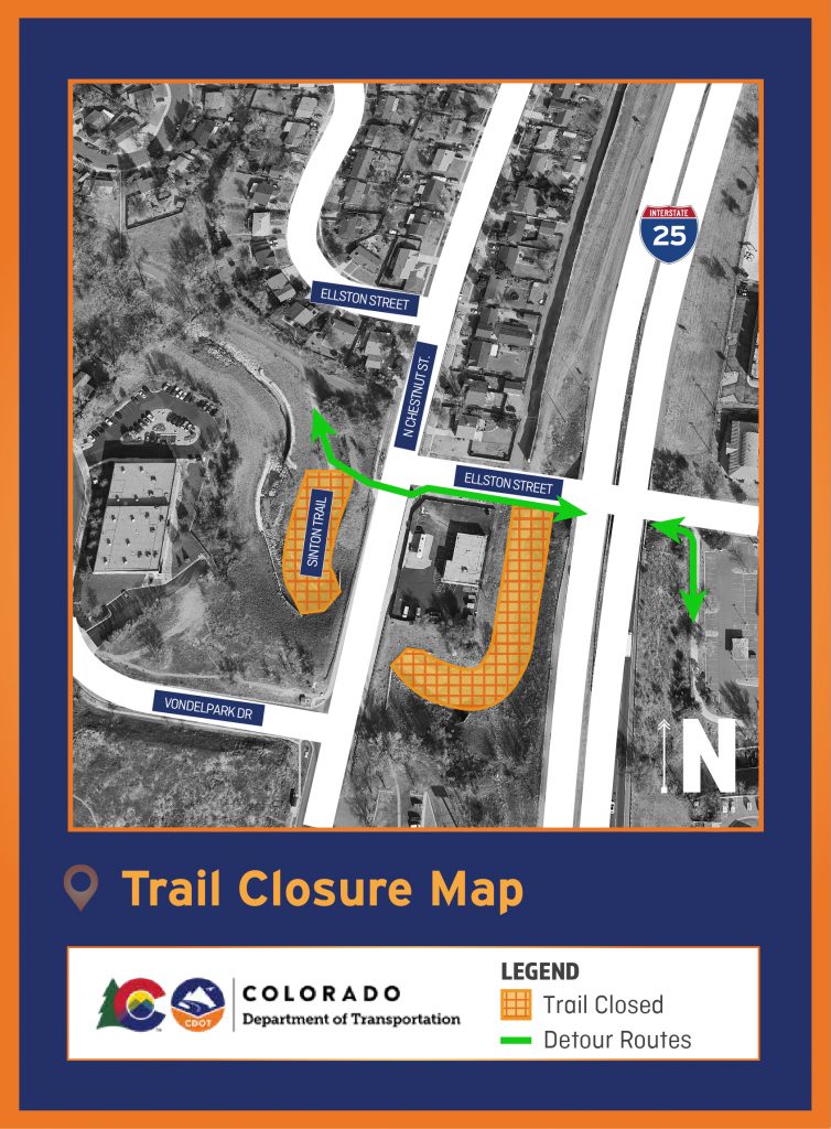 As part of the auxiliary lane project, the aging bridges on I-25 over Ellston Street will be reconstructed and widened. This work will also require several short-term, temporary closures of portions of the Sinton Trail and Ellston Street under I-25. Once this bridge/demolition work is scheduled, bike/pedestrian alternate routes will be put in place and signed.
